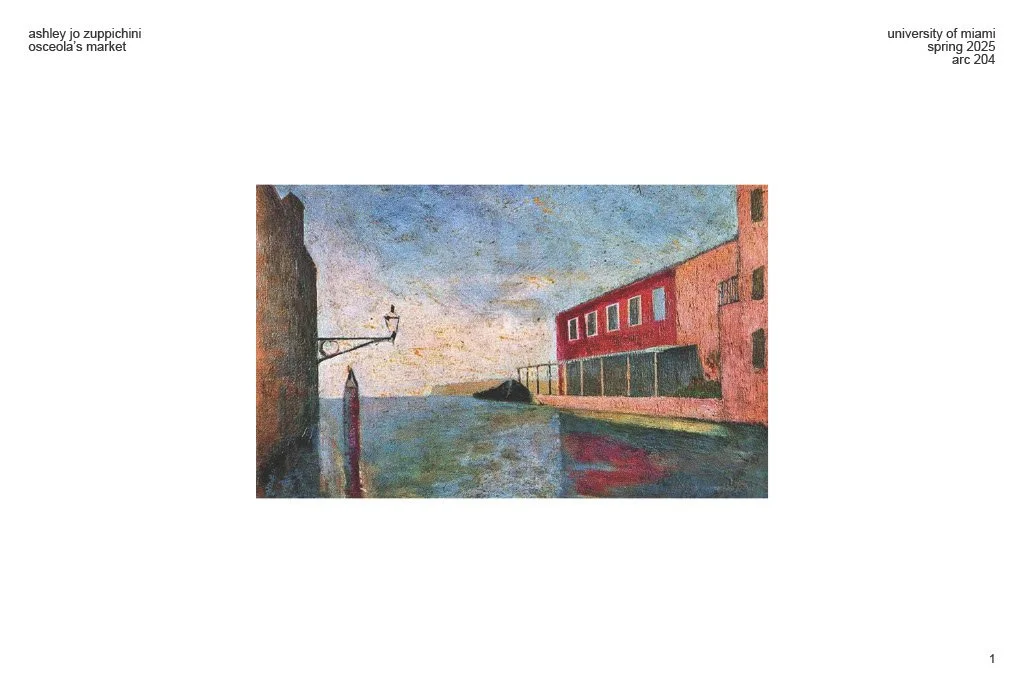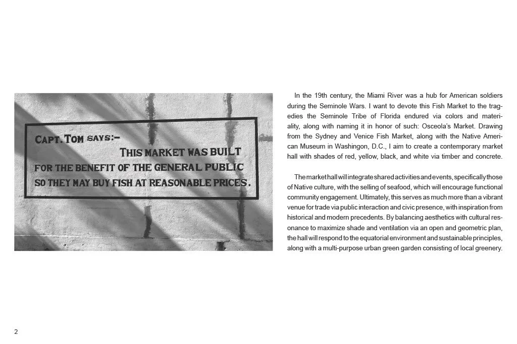 In the 19th century, the Miami River was a hub for American soldiers during the Seminole Wars. I want to devote this Fish Market to the tragedies the Seminole Tribe of Florida endured via colors and materiality, along with naming it in honor of such: Osceola’s Market. Drawing from the Sydney and Venice Fish Market, along with the Native American Museum in Washington, D.C., I aim to create a contemporary market hall with shades of red, yellow, black, and white via timber and concrete.